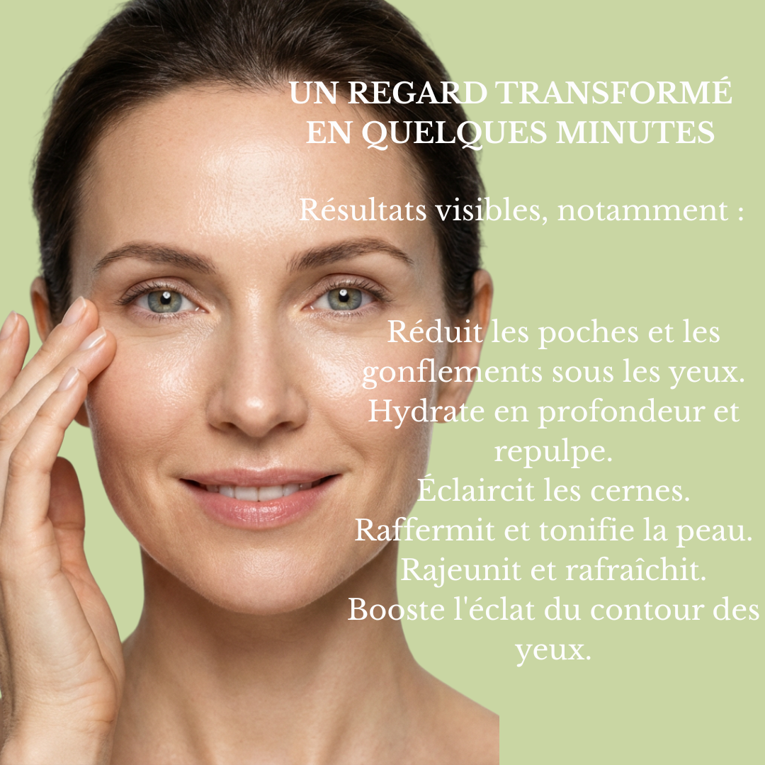 La plupart des utilisatrices remarquent une diminution des poches et une peau plus lisse dès les premières utilisations. Avec une routine régulière, les ridules s’atténuent et le regard devient visiblement plus lumineux en 2 à 4 semaines.